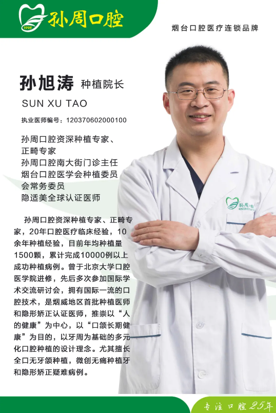 所以,种植牙除了要有好的材料,还得有好的医生去做。一位种植专家,不仅要有扎实的理论知识,还要有丰富的临床经验,保证患者的种植牙能长期稳定的使用。“让患者实实在在因牙齿的改变而让生活变得更幸福”这是孙旭涛院长的信条,也是25年孙周口腔所坚持的最恒远的理念。