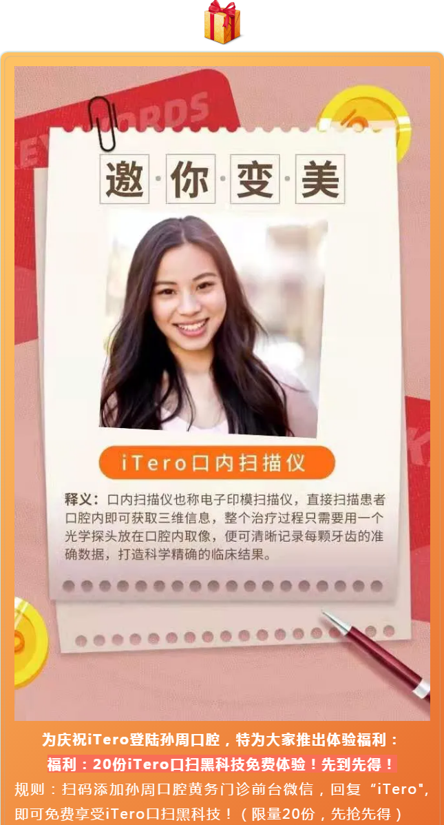 网红黑科技!全球顶尖黑科技iTero智能口内扫描仪近日已经正式登陆孙周口腔。让您告别传统取模的不适和方案的漫长等待。仅需5分钟,就可预见未来的最美的自己!