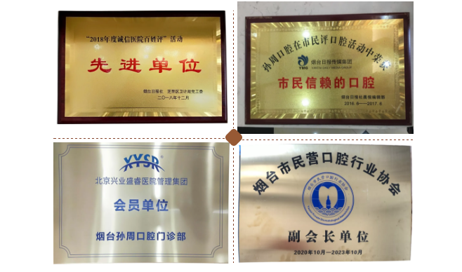 建院至今,孙周口腔凭借专业的技术与优质的服务,荣获芝罘区卫健系统的“先进单位”、“市民信赖的口腔”、“烟台民营口腔行业协会副会长单位”北京兴业盛睿医院管理集团会员单位”等各大机构及行业的荣誉资质认证。